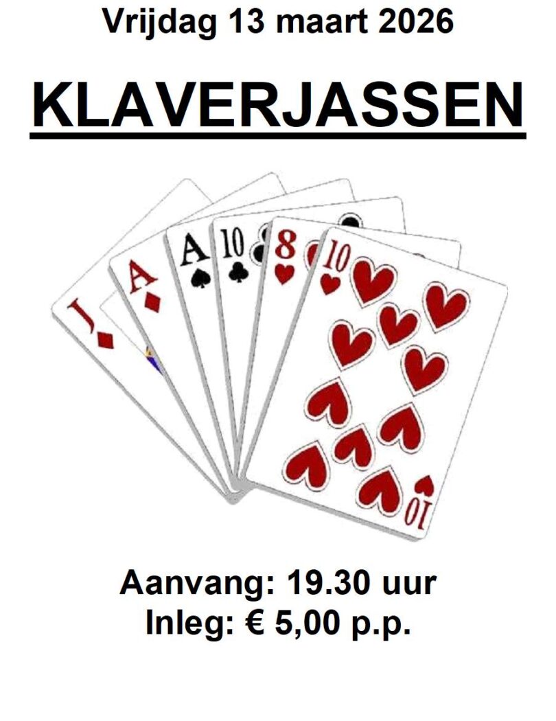 Aankomende vrijdag, 13 maart 2026, gaan we weer KLAVERJASSEN!!!