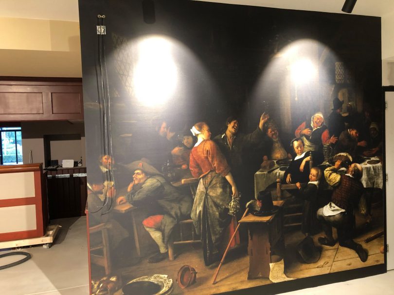 In de achterzaal zijn alle lampen opgehangen. Naast de drie hanglampen komen ook hier weer de lampen in de rails terug, net als in de lunchroom. Deze kunnen straks op de dartborden worden gericht, maar ook kunnen ze de tafels in de achterzaal van licht gaan voorzien. Ook is er op één van de wanden een prachtige fotoprint aangebracht. Volgende week zullen er nog twee fotoprints volgen op andere muren in het café.
